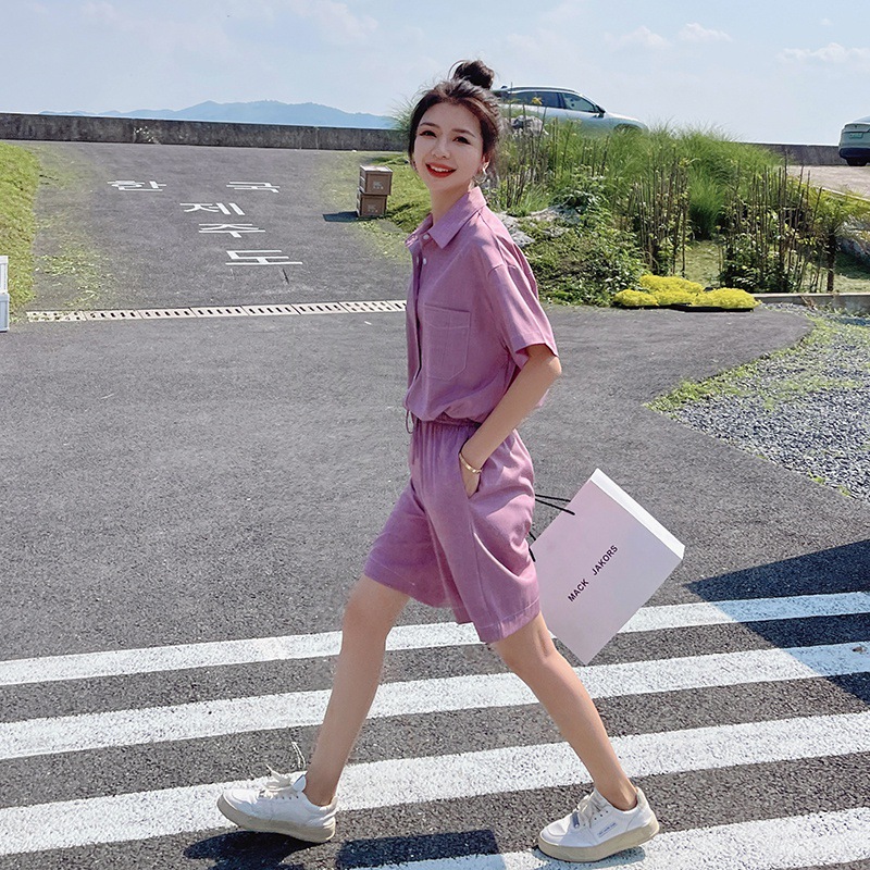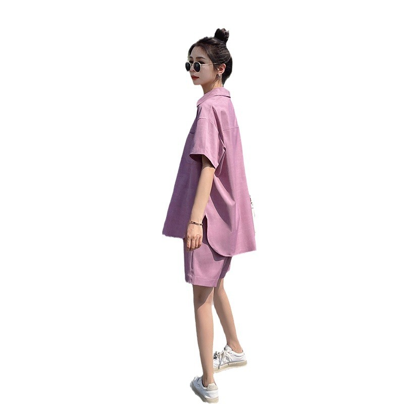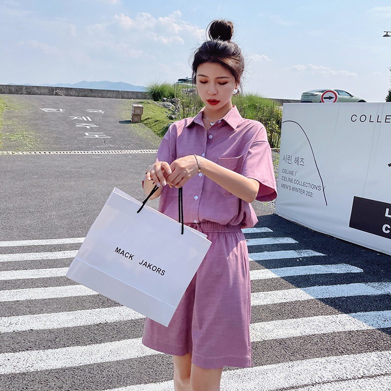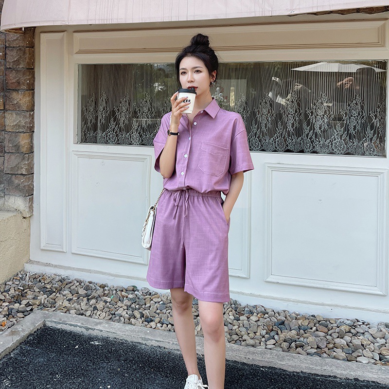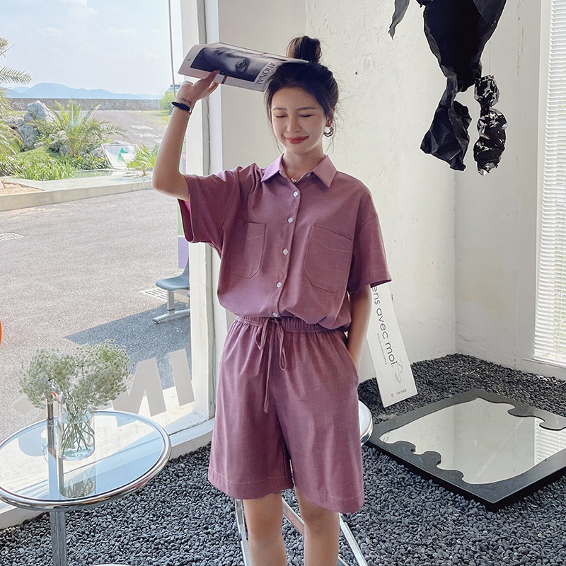 韩系休闲衬衫领落肩短款上衣阔腿裤两件套高腰抽绳系带时尚套装女
