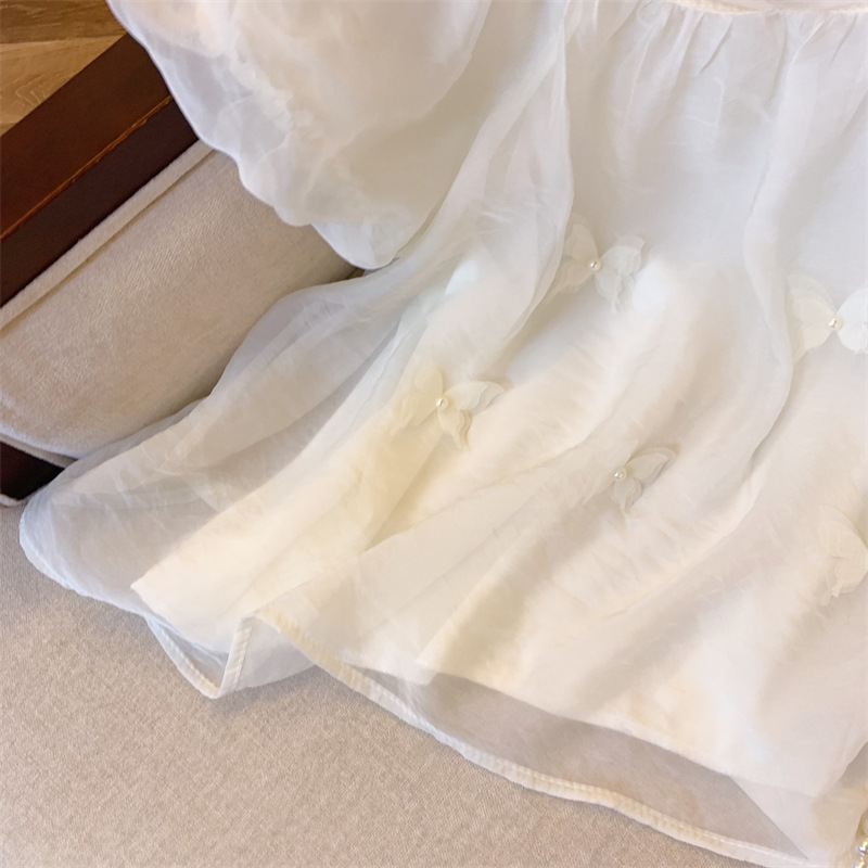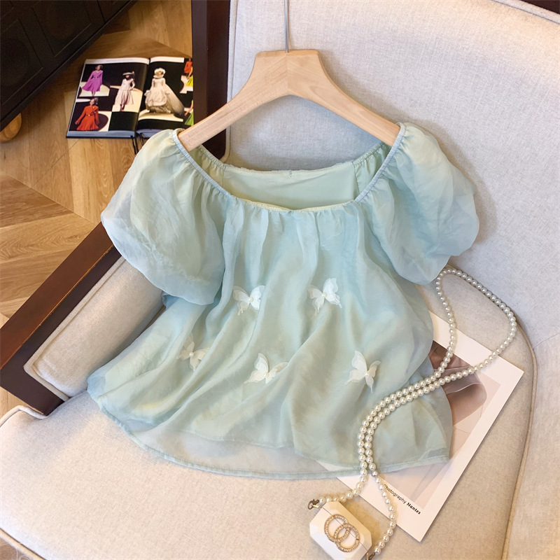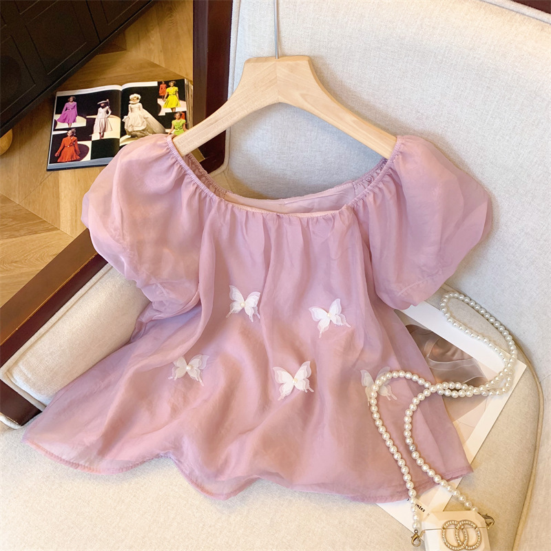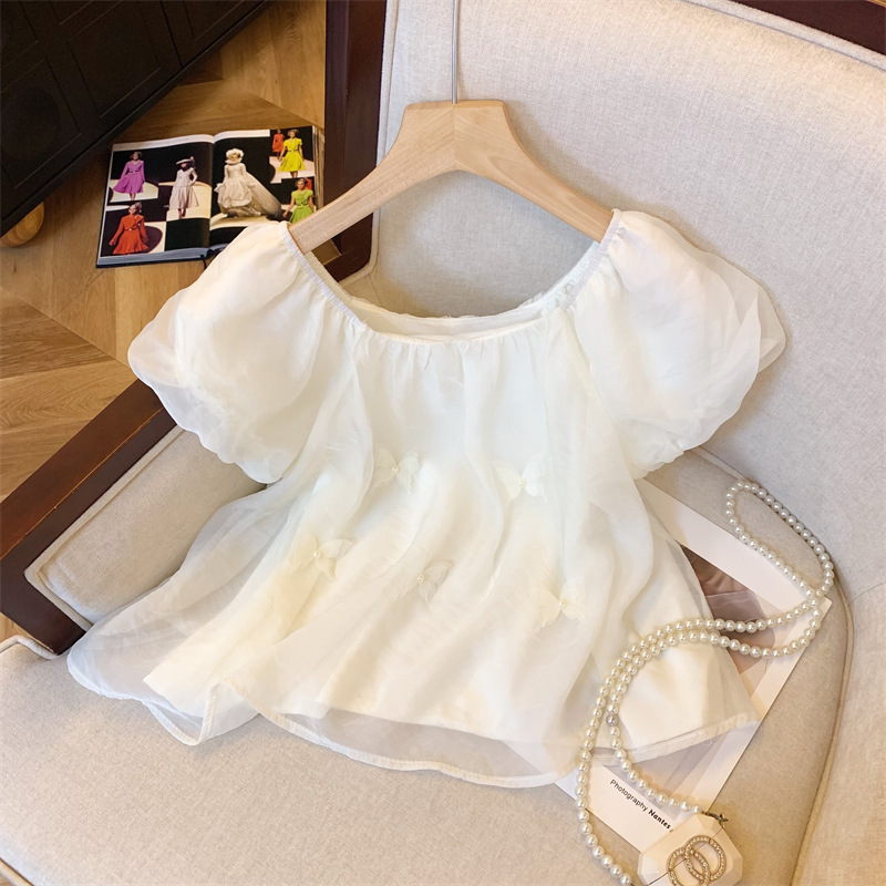 实拍奶系温柔上衣气质超仙绝美高级立体蝴蝶泡泡袖欧根纱小衫女夏