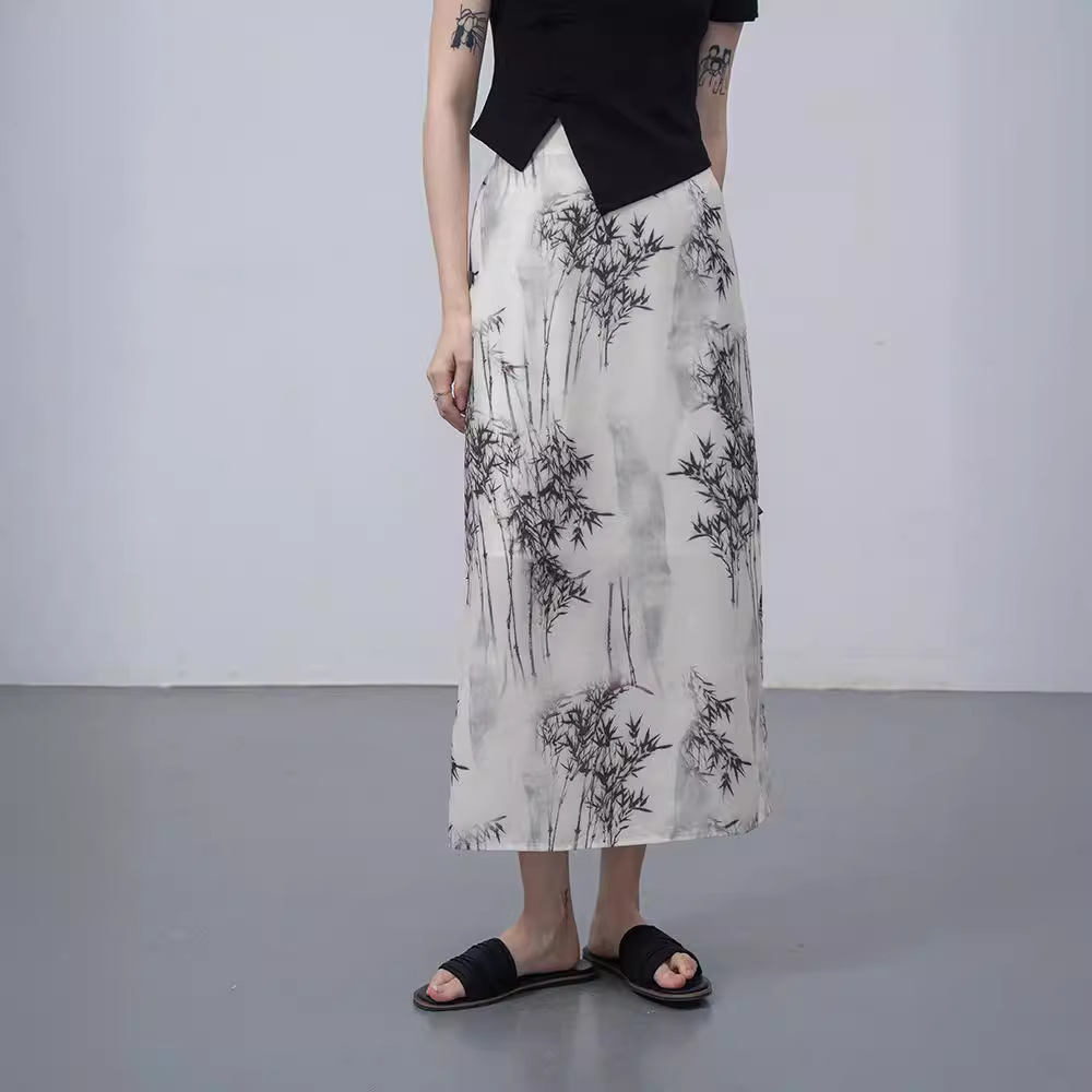 新中式半身裙女夏季设计感小众高腰半裙显瘦a字裙子开叉长裙