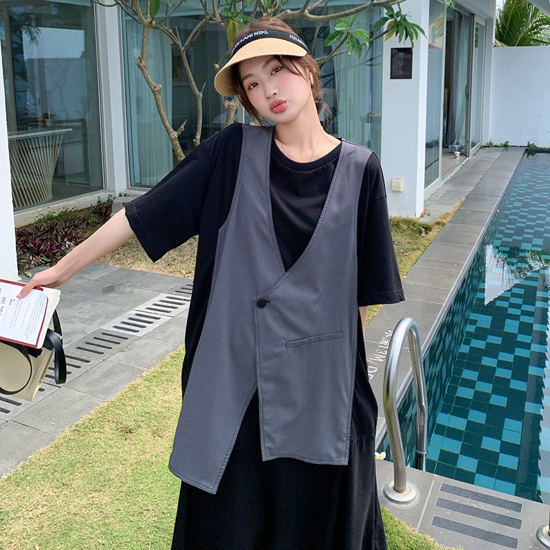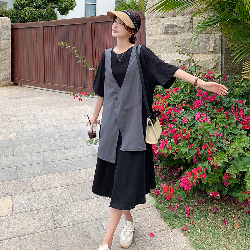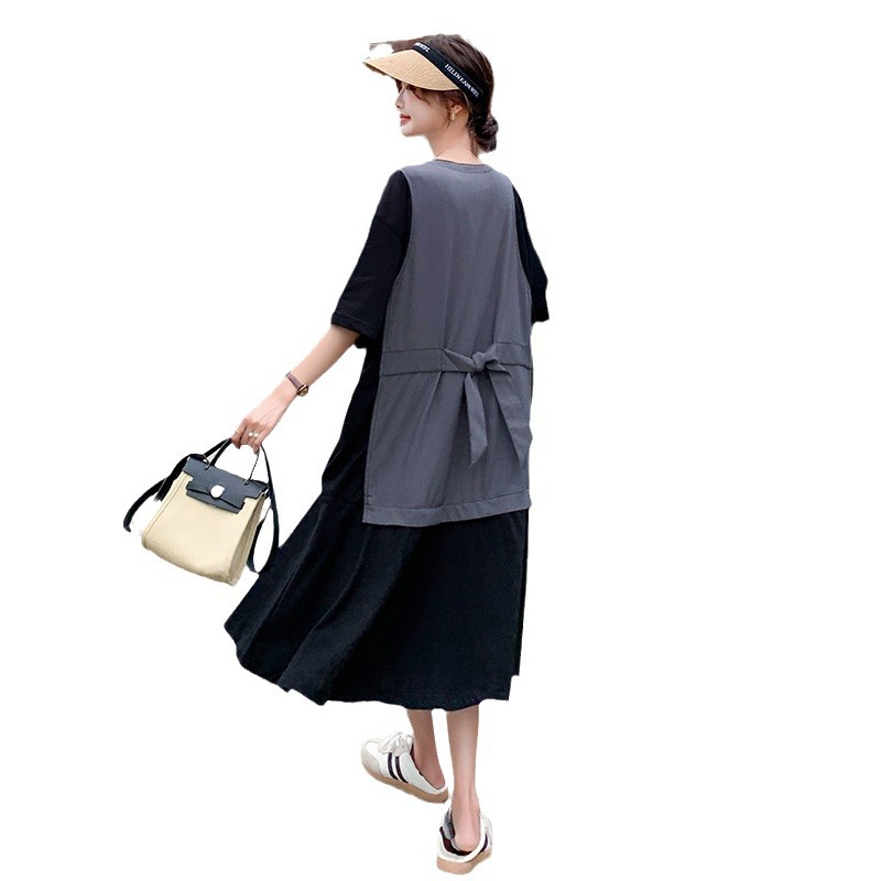 休闲风设计款马甲假两件夏新款连衣裙撞色圆领落肩拼接中长裙
