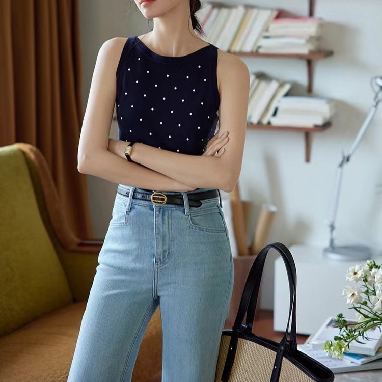 藏青色/米白色波点背心吊带女夏季法式复古无袖外穿上衣