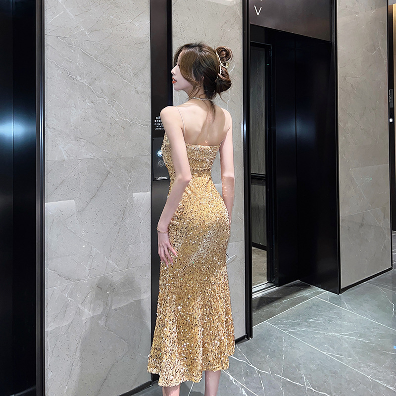 名媛风礼服裙闪闪丝绒亮片性感v领晚装吊带连衣裙长款鱼尾裙夏季