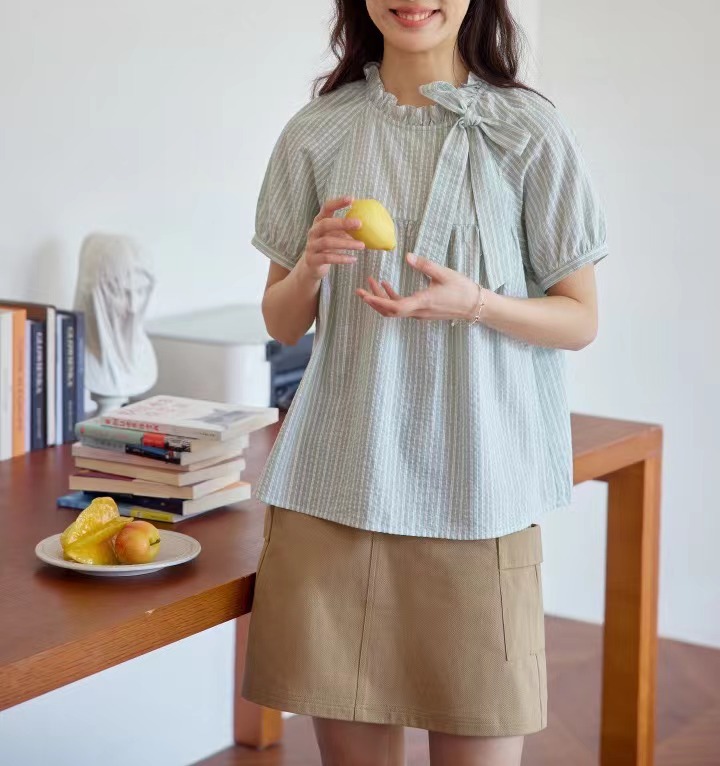 绿色条纹衬衫女法式温柔风木耳边设计感宽松小衫