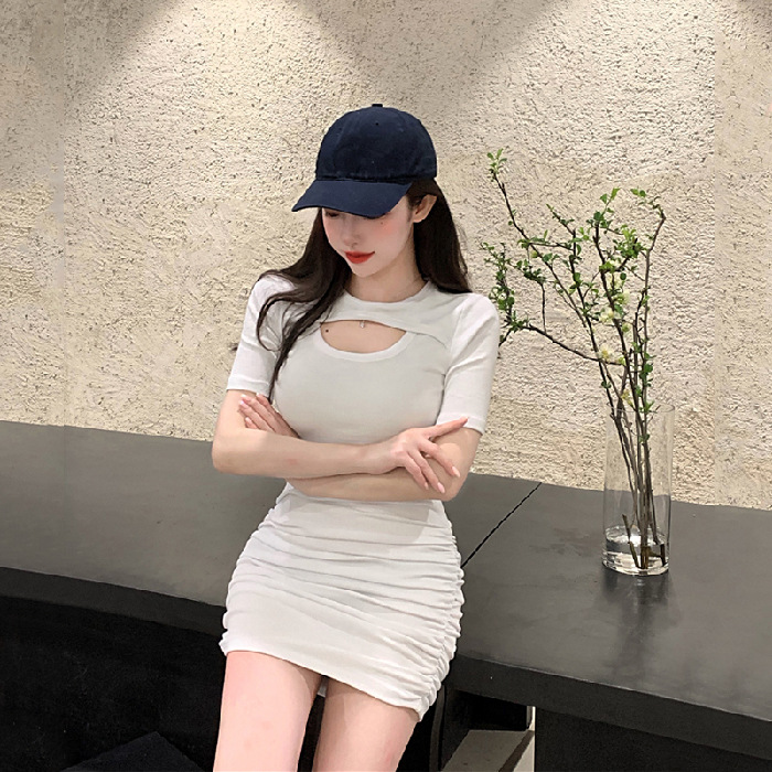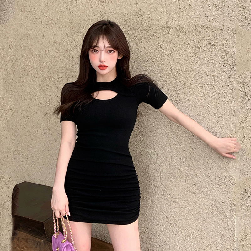 韩系chic纯色高腰褶皱包臀短裙小个子修身仙女裙夏镂空连衣裙