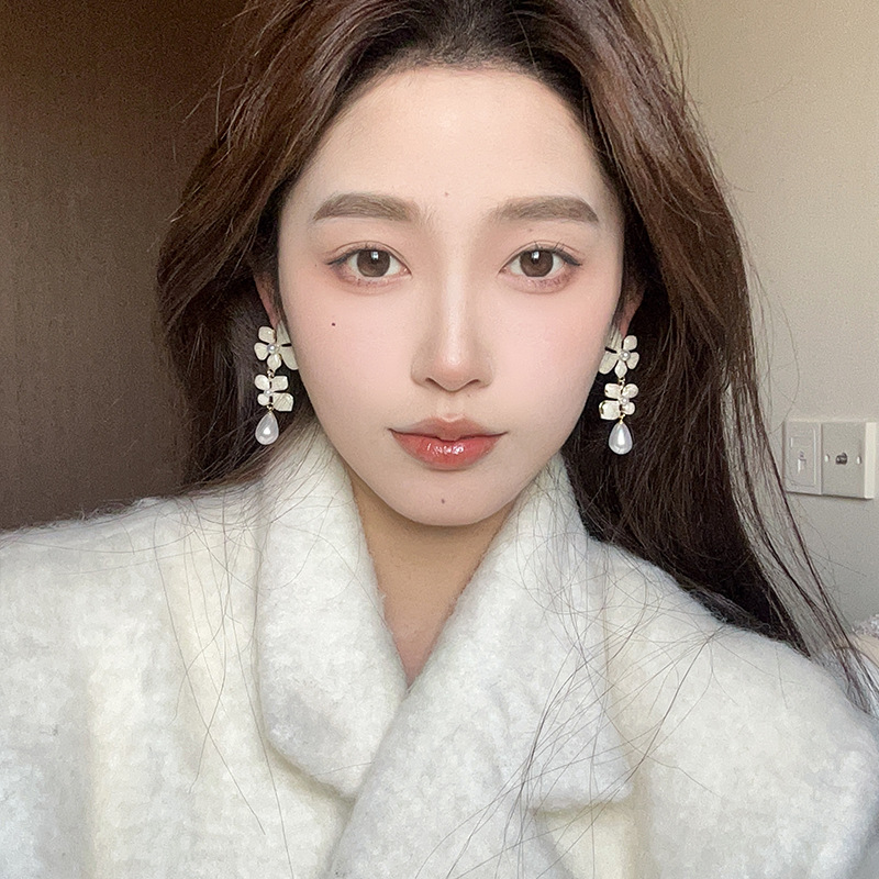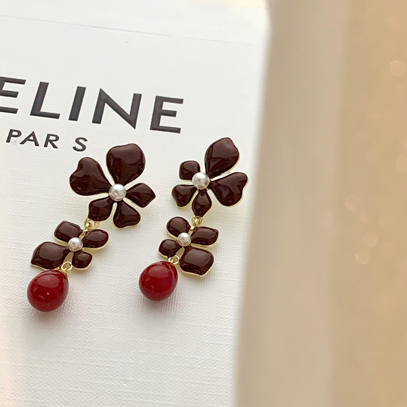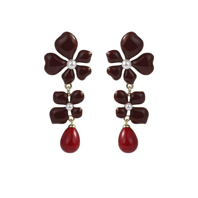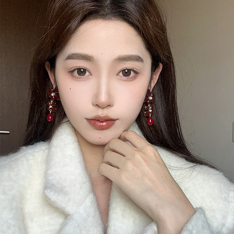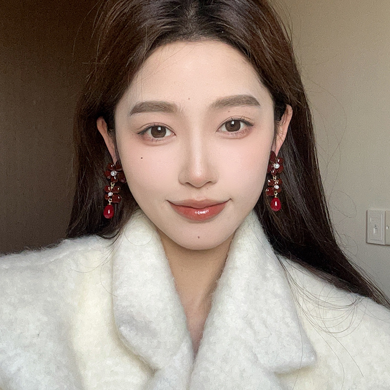 新年酒红色复古花朵水滴耳环气质个性高级感耳坠小众夸张过年耳饰