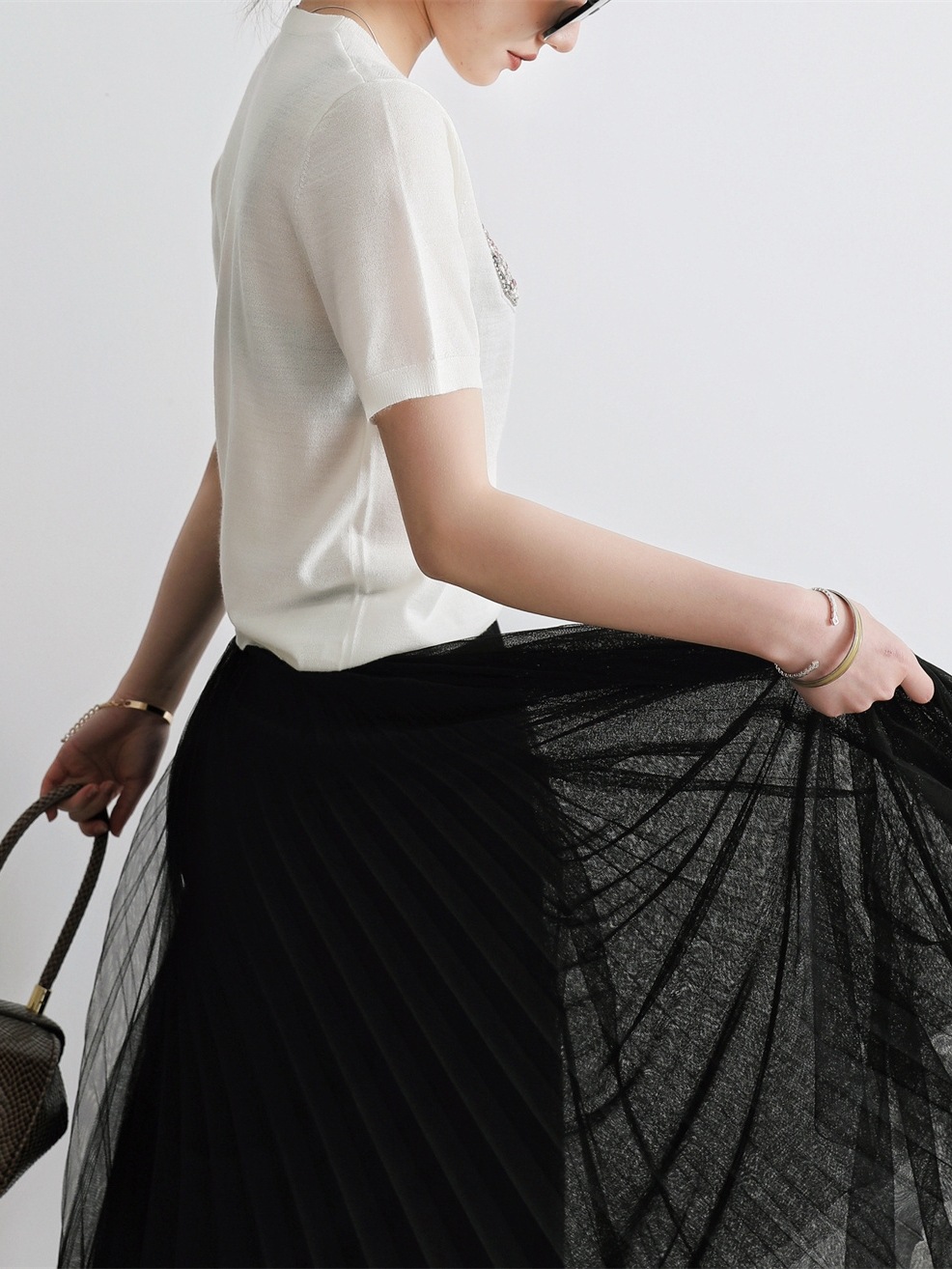 有点文艺复古小奢水钻贴布极简圆领美丽诺羊毛短袖针织衫