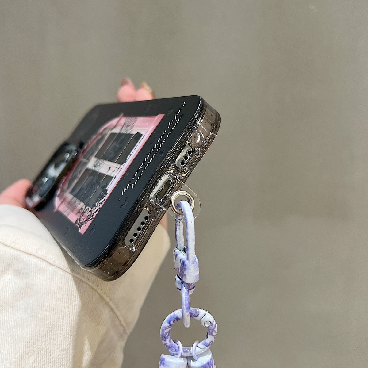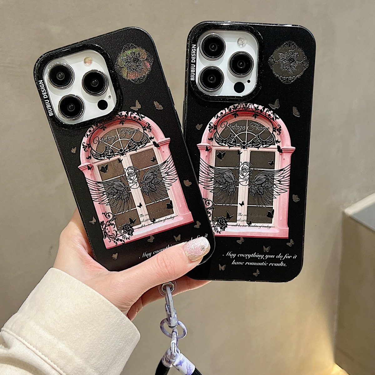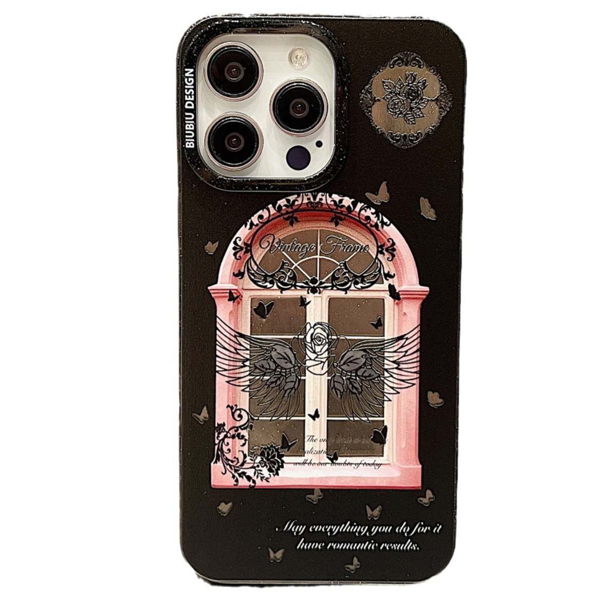 炫彩黑底粉窗户翅膀适用15ProMax手机壳防摔14pro苹果13闪粉羽纱