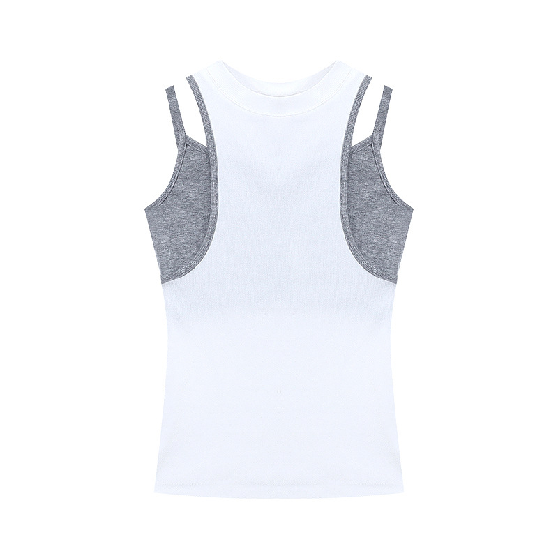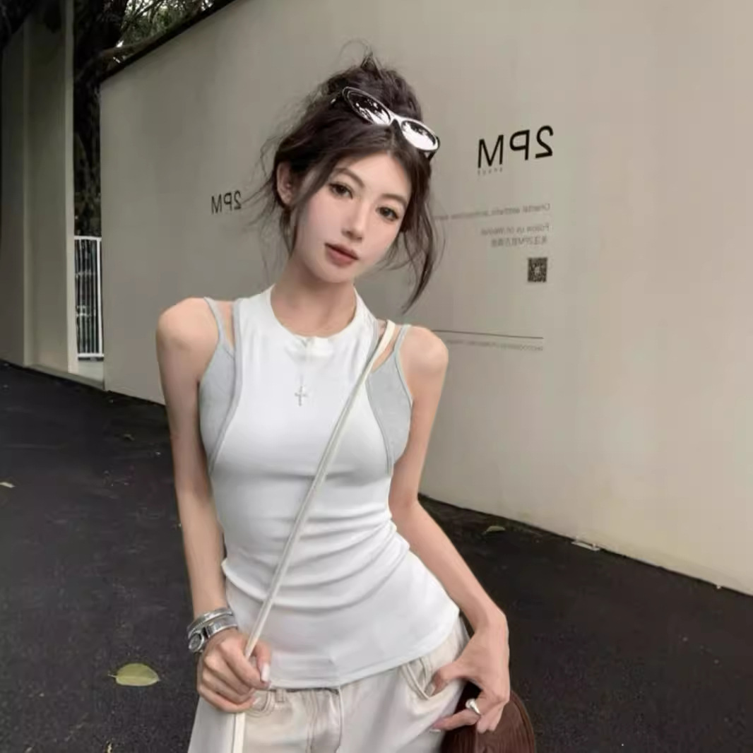 美式辣妹白色吊带背心女夏季设计感小众假两件修身弹力无袖上衣潮