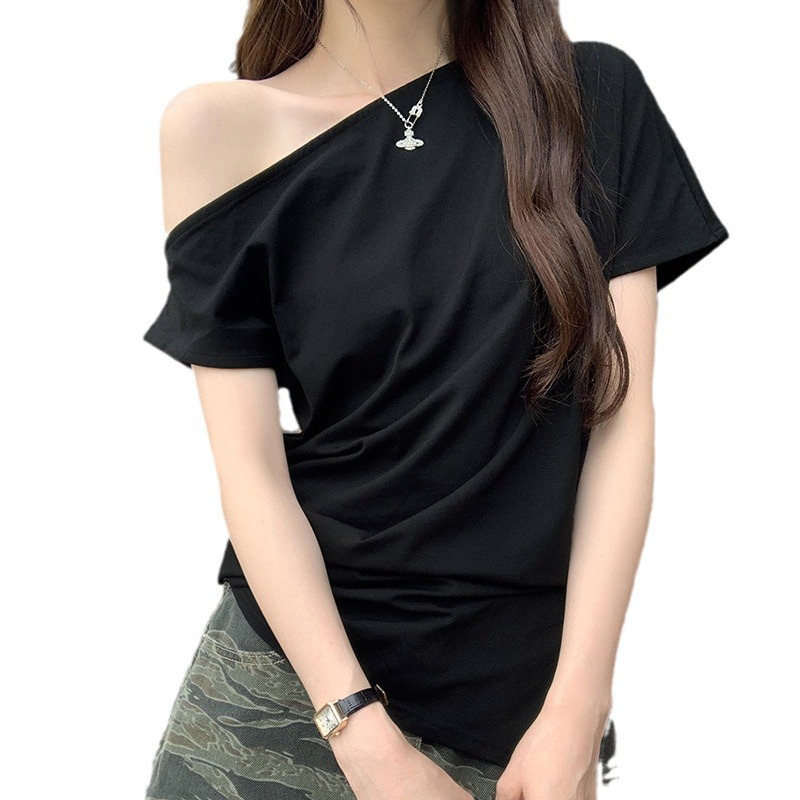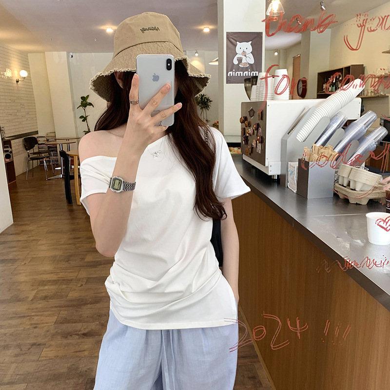 侧缝开叉不规则露肩短袖T恤女夏季新款设计感小众慵懒风绝美上衣
