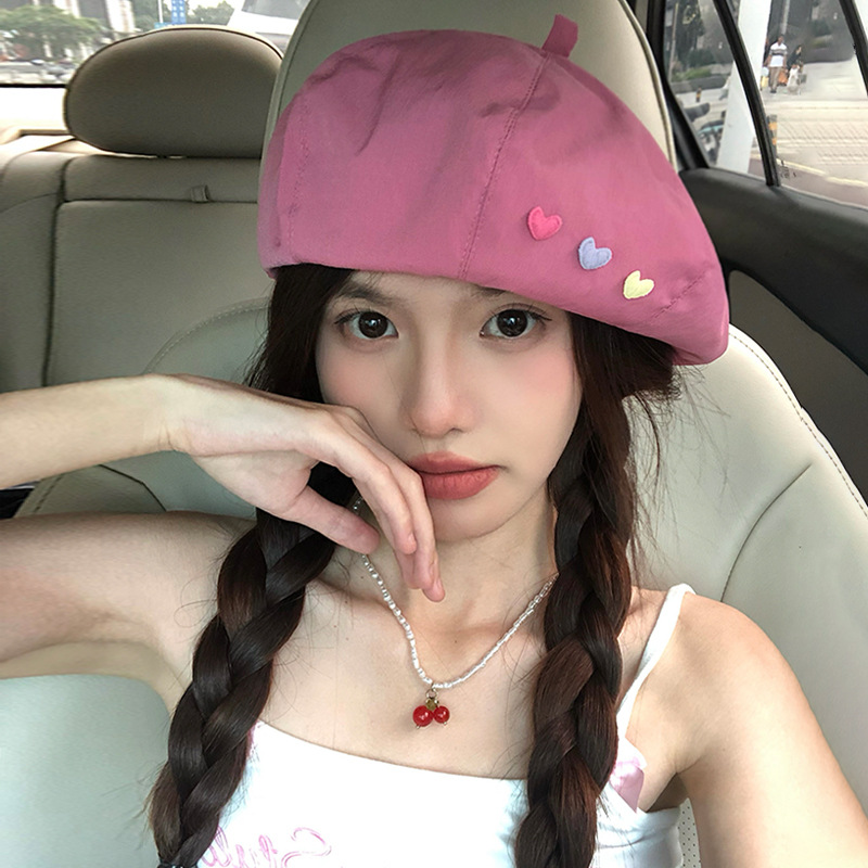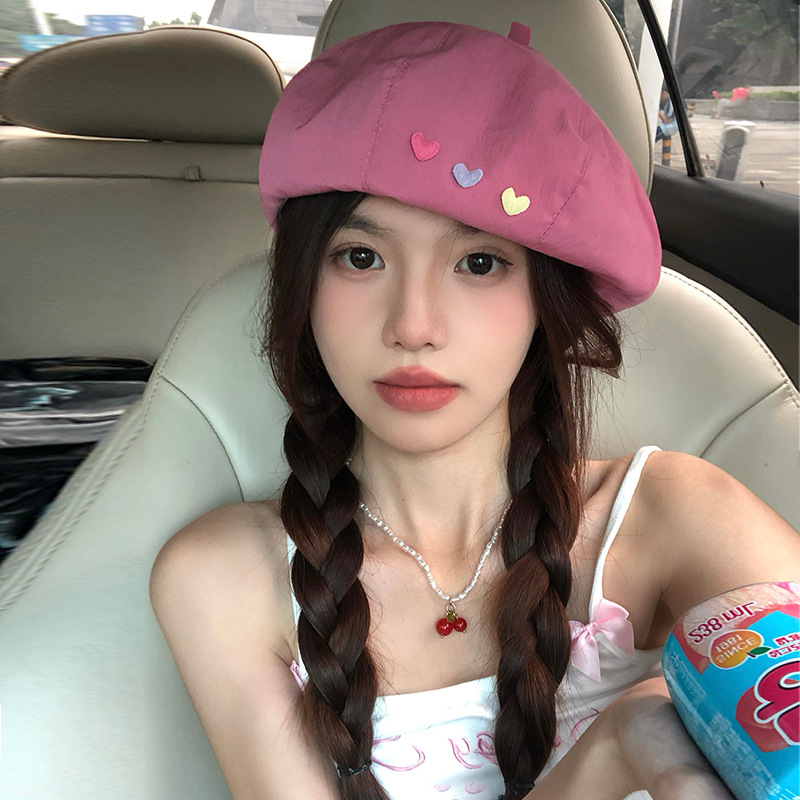 日系甜妹爱心贝雷帽女夏季百搭大头围显脸小薄款透气画家蓓蕾帽子