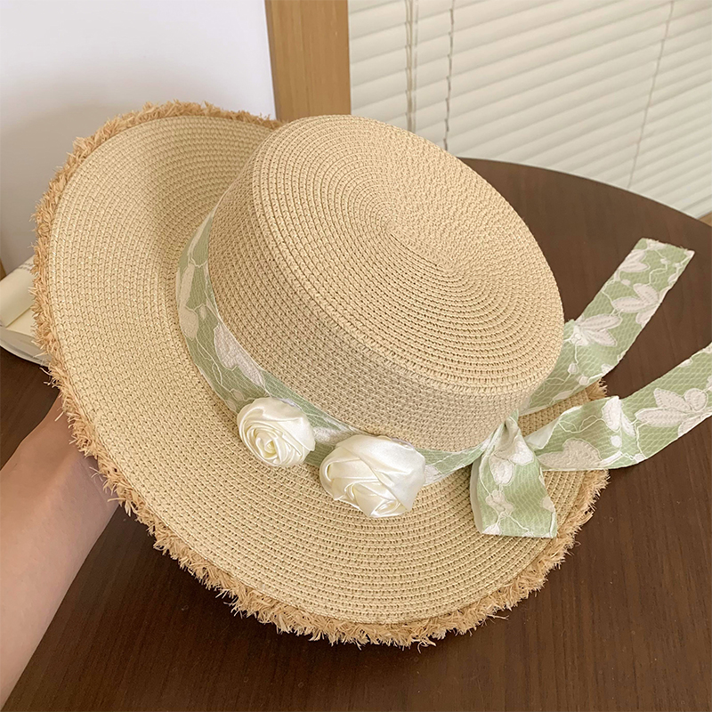 法式蝴蝶结花朵平顶拉菲草帽女夏天海边沙滩遮阳帽子大帽檐太阳帽