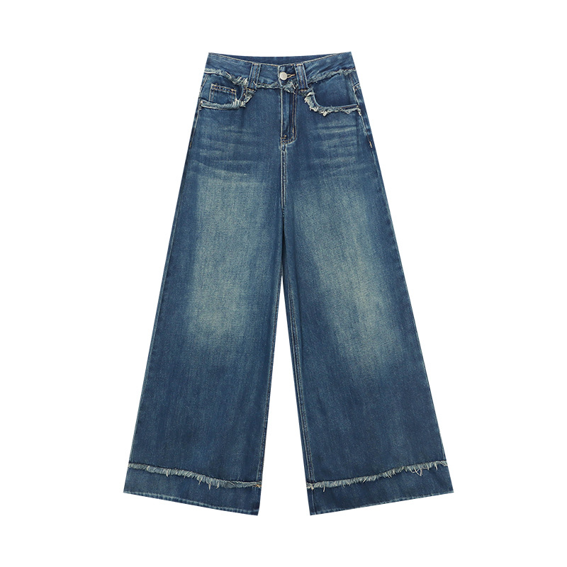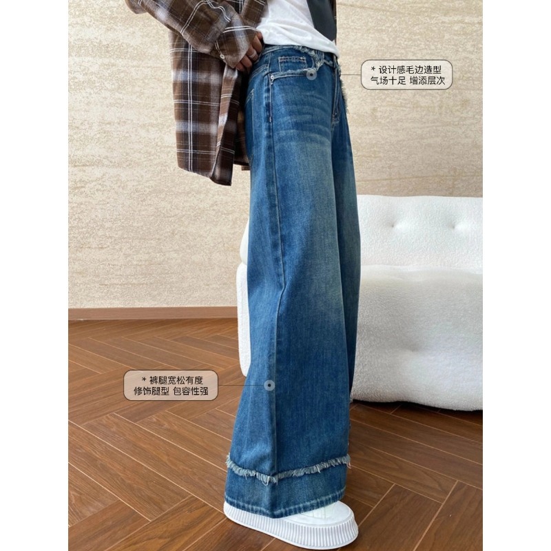 司南时髦尖子生设计感做旧毛边直筒高腰阔腿拖地牛仔裤
