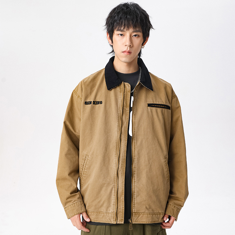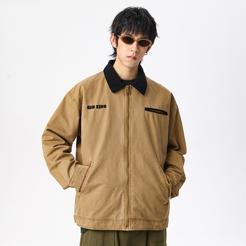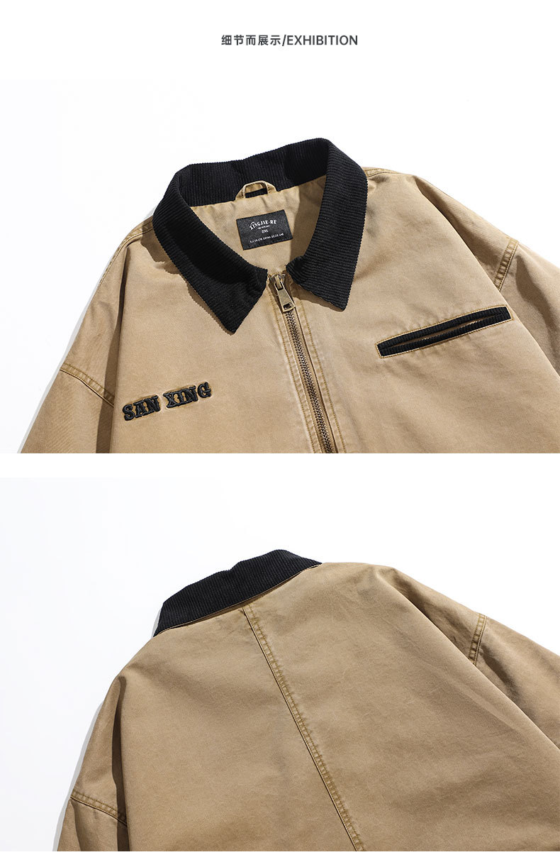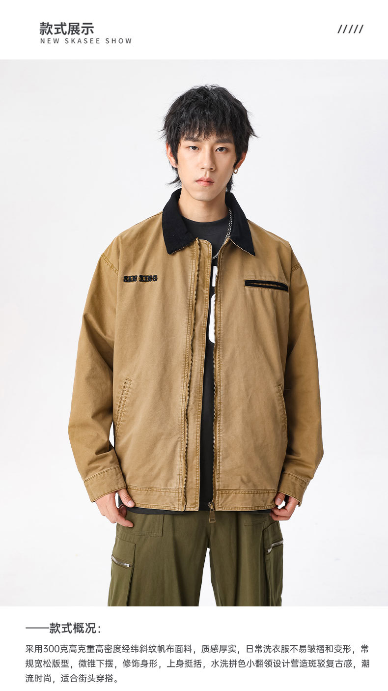 LKTM男装#高密双经斜棉300g重磅翻领夹克男水洗字母刺绣休闲外套
