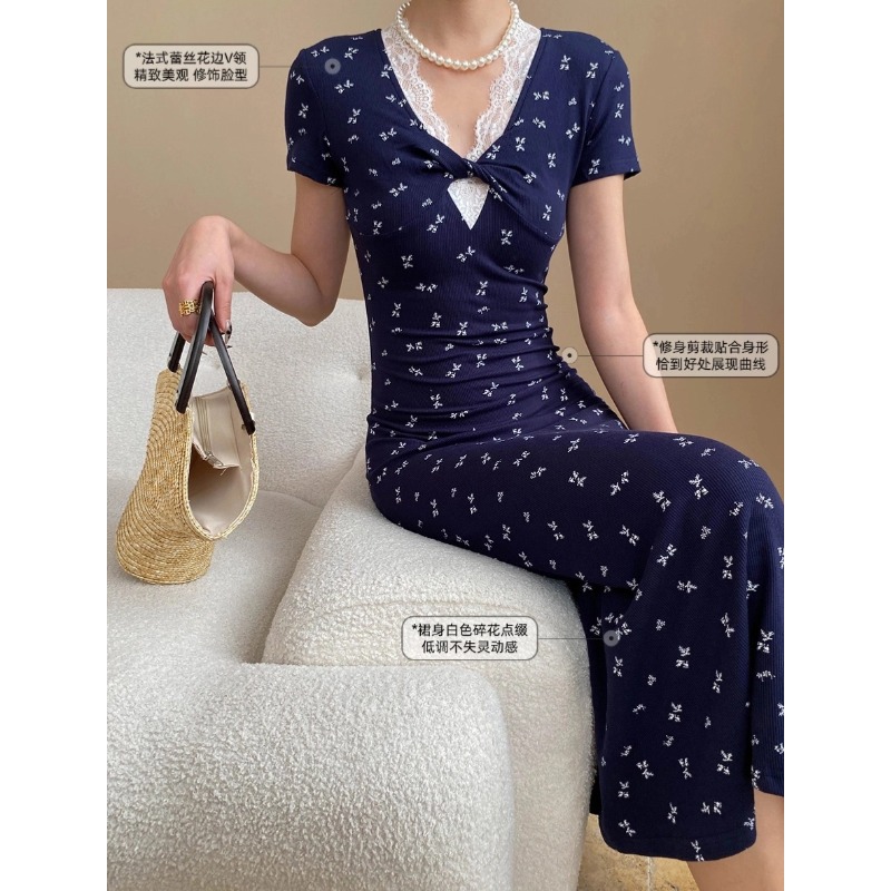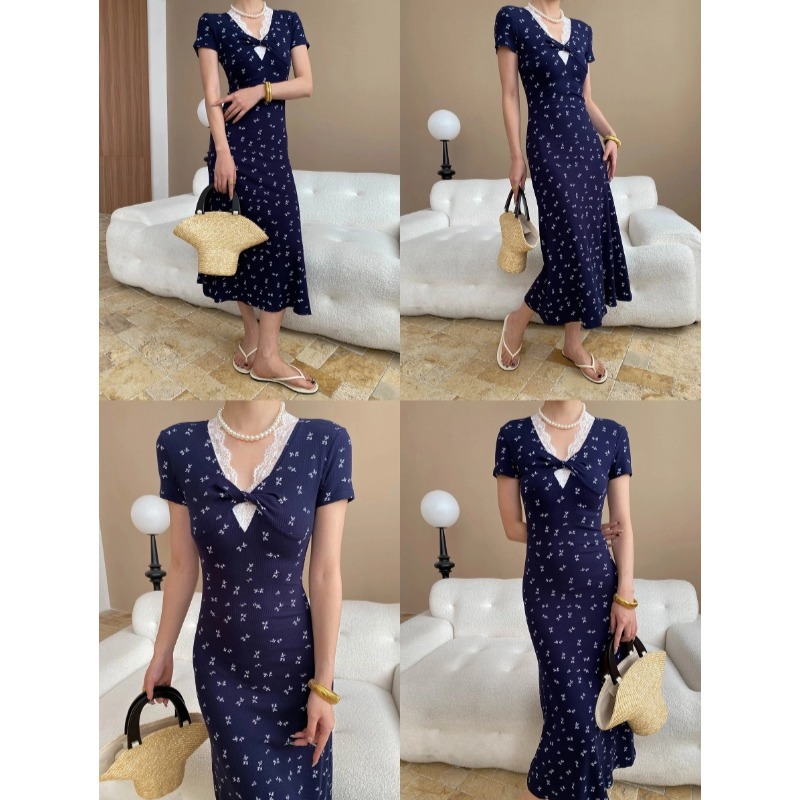 司南法式茶歇风设计感扭结蕾丝花边V领碎花显瘦连衣裙